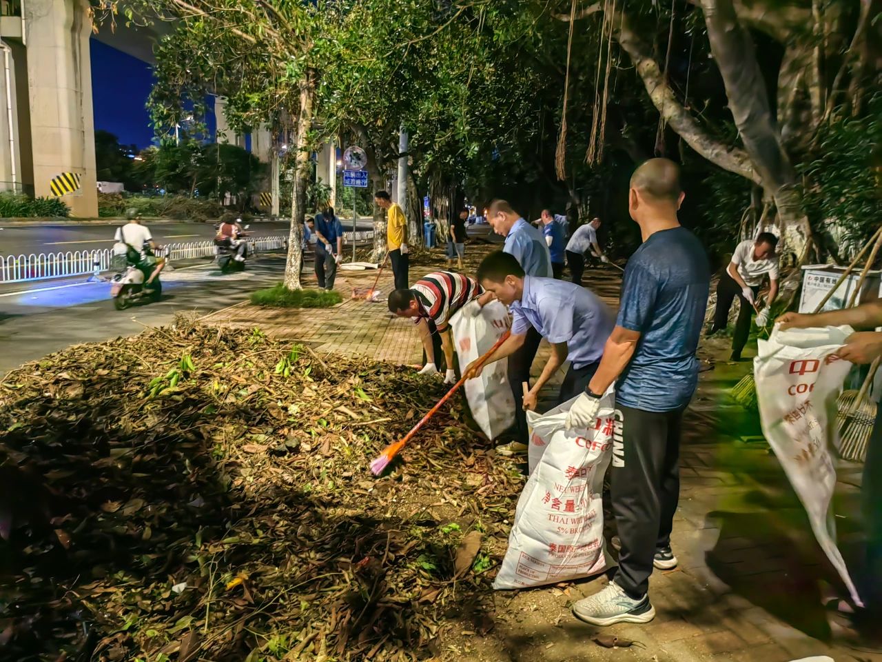 當(dāng)晚抵達(dá)后,在黨員干部的帶領(lǐng)下,他們馬不停蹄,就地在海秀鎮(zhèn)、永興鎮(zhèn)的街道上開(kāi)展路面清障工作。